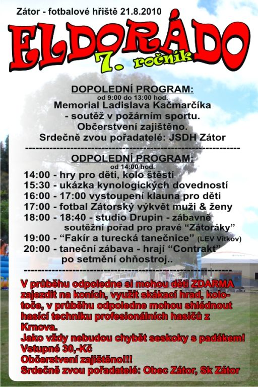 V sobotu 21. srpna 2010 za hojné účasti návštěvníků a krásného počasí se konal již 7. ročník ELDORÁDA. Den plný her, zábavy a sportu pro nás připravili JSDH Zátor, SK Zátor a Obec Zátor. Veškeré fotky si můžete prohlédnout na odkaze : http://talocan.rajce.idnes.cz/Eldorado_2010/